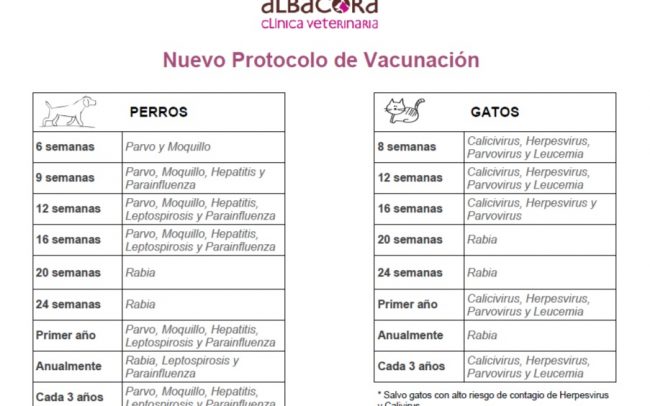 Desde este preciso momento en el que hemos publicamos esta información comenzamos a aplicar el nuevo calendario vacunal. Recuerda que si tienes alguna duda sobre esta información o sobre las próximas vacunas que le corresponden a tu perro o gato, estaremos como siempre encantados de atenderte en la Clínica Albacora (953.27.53.05)