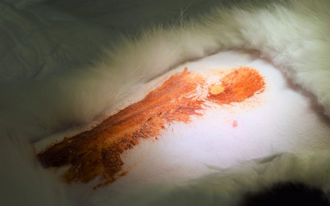 El último paso antes de empezar a operar es la preparación del campo quirúrgico. Nuestro paciente entrará en quirófano con la zona a intervenir rasurada, libre de pelo. Se lavará y limpiará esta zona así como su entorno (campo quirúrgico ) con antisépticos para eliminar la presencia de agentes contaminantes. Alrededor del campo quirúrgico colocaremos unos paños estériles que fijaremos con pinzas “cangrejo”.