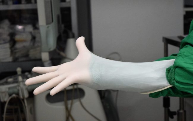 5.Por último, antes de entrar en quirófano, nuestra Auxiliar nos abre un paquete de guantes estériles.