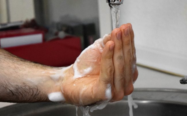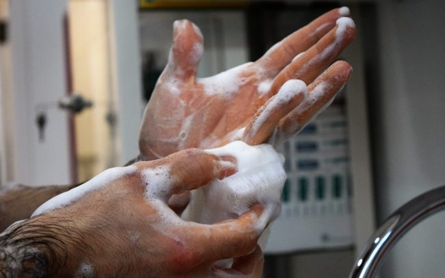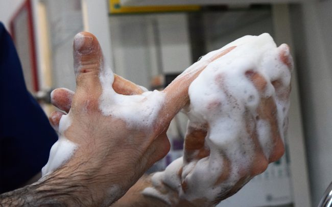 2.A continuación realizamos el lavado de manos y brazos con un antiséptico (clorhexidina). Comenzamos aproximando los brazos a un grifo de agua automático o abierto continuamente, pues desde este momento evitamos el contacto con cualquier objeto. Se humedecen los brazos hasta los codos y se frota la piel con una esponja empapada en clorhexidina. Siempre de forma meticulosa, desde la punta de los dedos hasta el codo. Para conseguir una óptima desinfección, se recomienda dejar en contacto el antiséptico en contacto con la piel entre 7 – 10 minutos. Aclaramos finalmente con agua, de nuevo desde la punta de los dedos hasta el codo.
