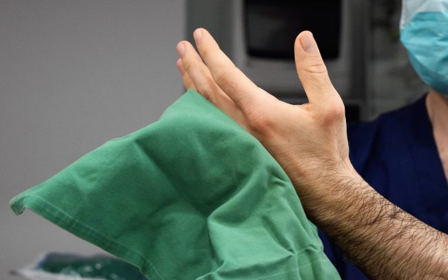 3.Llevamos los brazos cercanos al cuerpo hasta que nuestra Auxiliar nos proporciona el secamanos. Con éste secaremos dedo a dedo de cada mano, incluidos los antebrazos y nuevamente de forma unidireccional y sin frotar, desde la punta de los dedos hasta el codo.